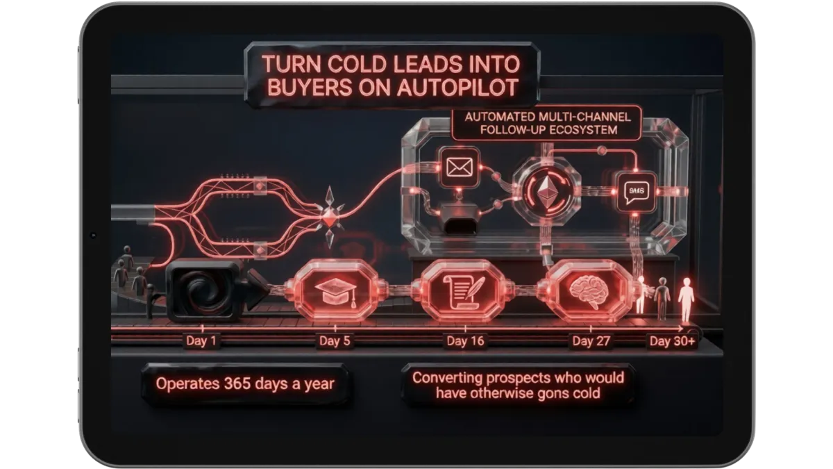 The majority of your traffic won't buy on the first visit. That doesn't mean they never will — it means they need time. Our automated multi-channel follow-up ecosystem nurtures every lead with education, authority-building content, and strategic offers over days and weeks. It operates 365 days a year, converting prospects who would have otherwise gone cold and forgotten you existed.