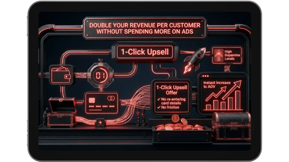 Our 1-click upsell system presents the next logical offer at exactly that moment — no re-entering card details, no friction.