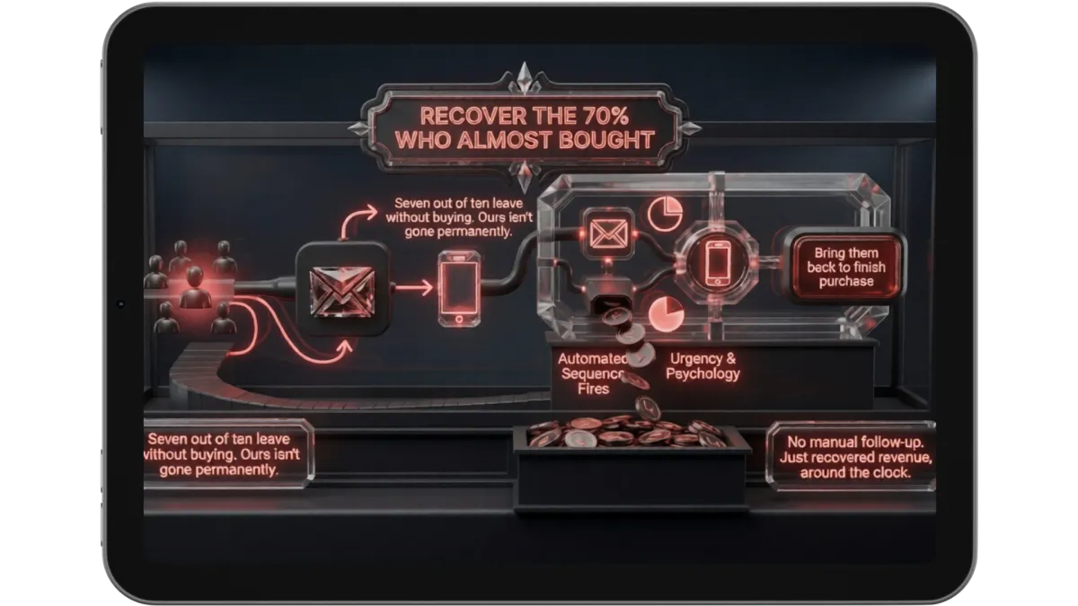 Seven out of ten people who reach your checkout will leave without buying. Without a recovery system, that revenue is gone permanently.