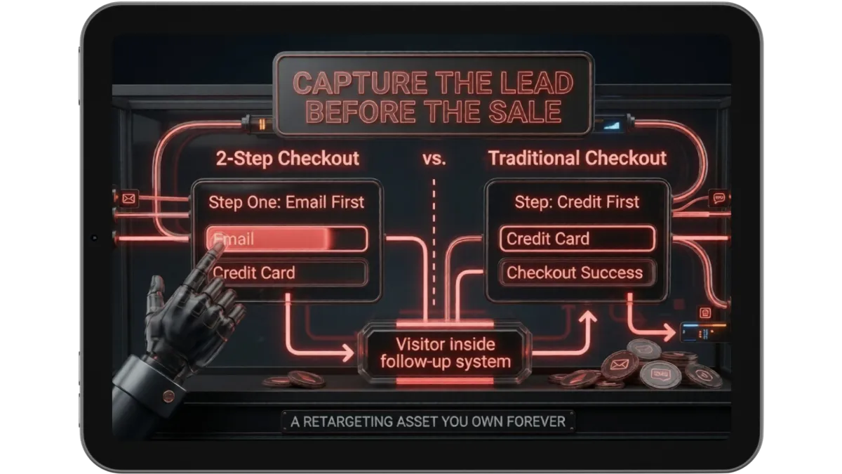Most checkouts ask for the credit card first and the email never. That's backwards. Our 2-step checkout captures the visitor's email on step one, before they ever reach payment. The moment they click away, they're already inside your follow-up system — a retargeting asset you own forever, regardless of whether they bought.