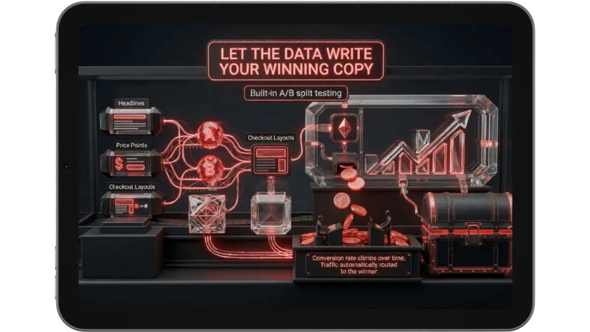 Built-in A/B split testing continuously runs variations of your headlines, price points, and checkout layouts against each other — automatically routing more traffic to whichever version wins. Over time, your conversion rate climbs without you spending an extra cent on traffic.